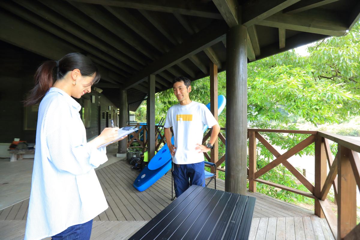 受付、レクチャー、実践含め、所要時間は1時間30分程度。「川平キャンプ場」、「COMMON IDOE」キャンプ場、「NIPPONIA 甲佐 疏水の郷(宿泊客のみ)」の3カ所のいずれかの場所で受付けできます。受付書類に記入して体験料金を支払い、ライフジャケットを装着したらレクチャースタート。インストラクターがSUPボードの乗り方やパドルの扱い方、川へ落ちてしまった時の対処法について詳しく説明してくれます。