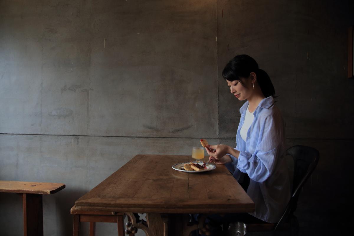 まるでヨーロッパの路地裏に迷い込んだようなシックでおしゃれな雰囲気ですが、なんと元は豆腐屋さんの建物だとか。コンクリートに映える鮮やかなラグやアンティークテーブル、椅子などひとつひとつのインテリアに味わいがあり、凛とした空気に包まれます。