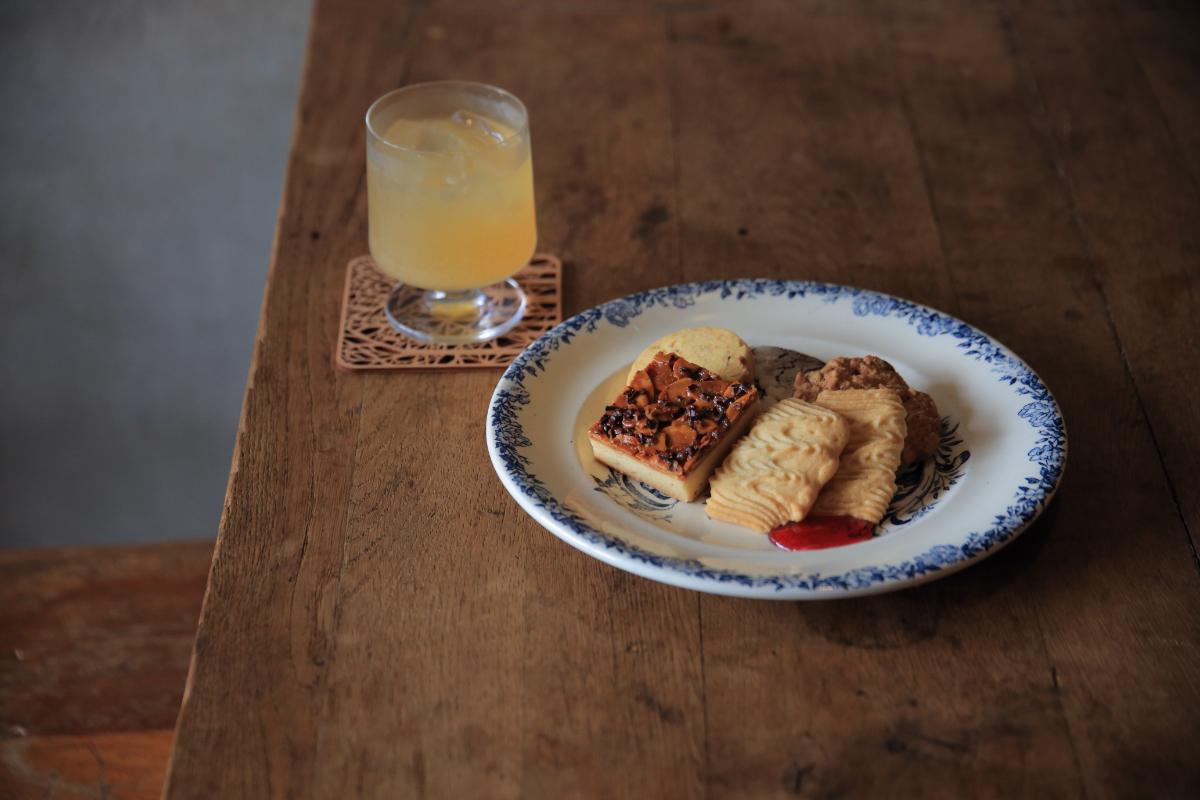 店内にはカフェスペースがあり、自家製シロップを使った季節のジュースやクレープ、アイスクリーム、購入した焼き菓子などがいただけます。写真は「日向夏のソーダ」500円(左奥)、焼き菓子「塩フロランタン」380円(左手前)、「サブレヴィエノワバニラ」380円(右手前)。アンティークなインテリアで彩られた素敵な空間で、おいしいひと時を過ごしましょう。