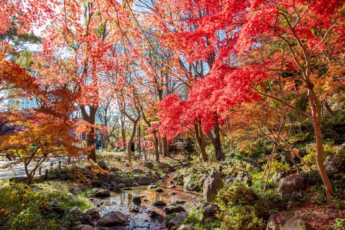 園内西側の19号地「もみじ谷」は、東京のど真ん中とは思えないほど自然を感じられるスポット。12月上旬~中旬、イロハモミジを中心とした紅葉が見られます。