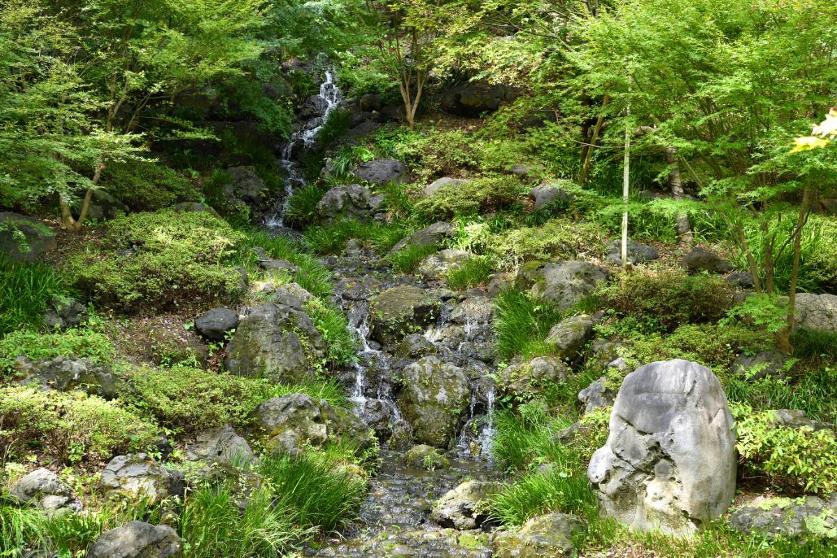 ここは明治期に活躍した日本人初のランドスケープデザイナー、長岡安平氏によって築造された渓谷です。大小の岩の間を小川が流れ、自然の崖線を利用した高さ約10mの滝もあります。