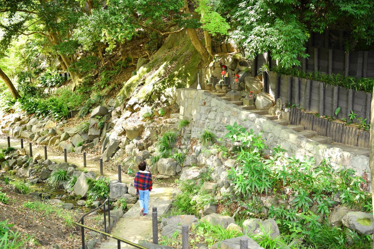 渓流沿いの石積みの階段の上にはお地蔵様が祭られています。一番上のお地蔵様の後ろの洞内には蛇塚があり、金運アップのパワースポットとして密かに人気なんですよ。