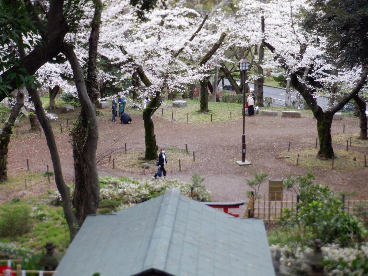 「芝丸山古墳」の上や麓には、ソメイヨシノやヤマザクラ、サトザクラなど、約30本が開花。写真下に屋根が写る、増上寺の裏鬼門に位置する「円山随身稲荷大明神」にもお参りしましょう。