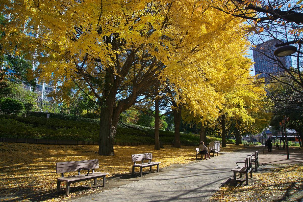 園内の北側、御成門駅A6出口から徒歩すぐの4号地「プロムナード」。イチョウの巨木から多目的運動広場まで約100m、真っすぐに並木道が延び、両脇にはアーチを造るような街灯とベンチが並んでいます。ドラマや映画のロケ地としても知られ、並木道の真ん中に東京タワーを据えた構図で写真が撮れる人気のフォトスポットです。近くには東京大空襲で焼け焦げた樹皮を残す戦災イチョウや児童遊園、港区立みなと図書館も。