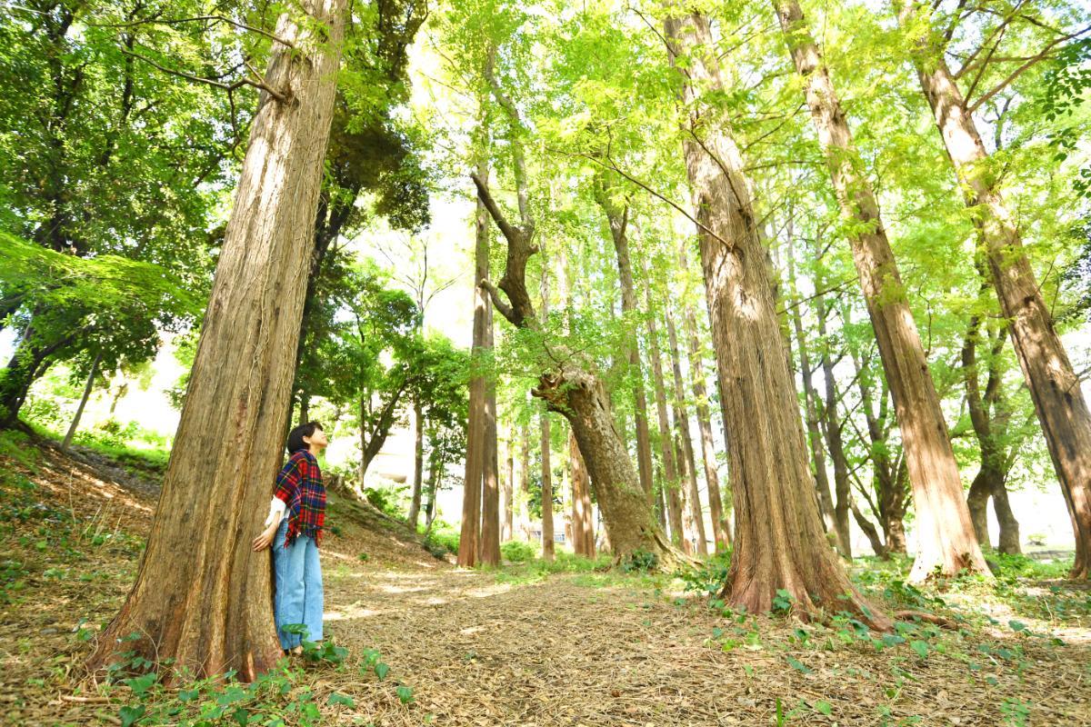 園内北西部の23号地にはメタセコイアの林が。真っすぐに直立する幹が特徴で、樹高は20~30mにも達し、12月ごろは葉が黄色からレンガ色に染まります。