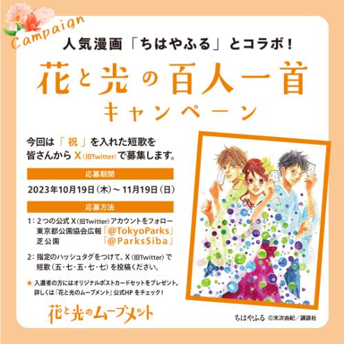 2023年夏~2024年春に「花と光のムーブメント」のイベントが開催される公園のうち、「東京都立葛西臨海公園」(終了)、「東京都立府中の森公園」、「東京都立芝公園」、「東京都立日比谷公園」、「東京都立浮間公園」の5つの公園では、大ヒット漫画『ちはやふる』とのコラボ企画も!『ちはやふる』は、花や植物が多く詠まれている百人一首の競技かるたにかけた青春を描いた人気漫画です。「花と光の百人一首」X(旧Twitter)投稿キャンペーンでは、5つの公園から各20首、合計100首を選出して、オリジナル百人一首を作ります。