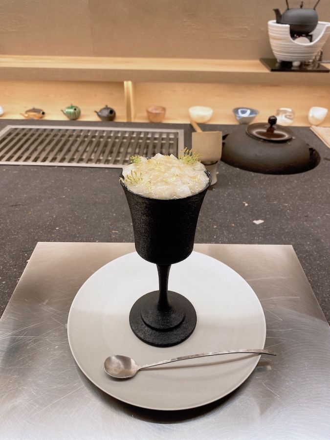 カウンターにはお茶を入れるための柄杓(ひしゃく)や茶釜が並び、店内奥には和田さんが日本各地から集めた茶器が並びます。高級感漂う店内の雰囲気から、ハードルが高そう…と感じる方もいるかもしれません。しかし「上質なお茶や旬のフルーツを気軽に楽しんでほしい」というお店の思いから、メニューはお茶菓子とパフェ、貴重なお茶がセットになったコースで4000円と、一般的なティーサロンと同等の価格。さらにカウンター越しにお茶を入れてくれる和田さんはとても気さくな方で、お茶や食器にまつわるこだわりをたっぷりとお話ししてくれました。