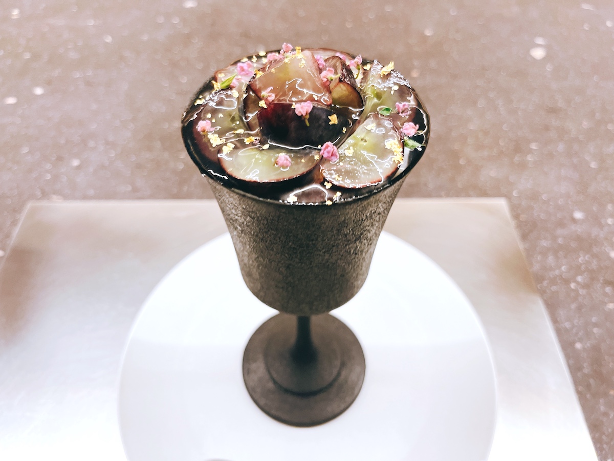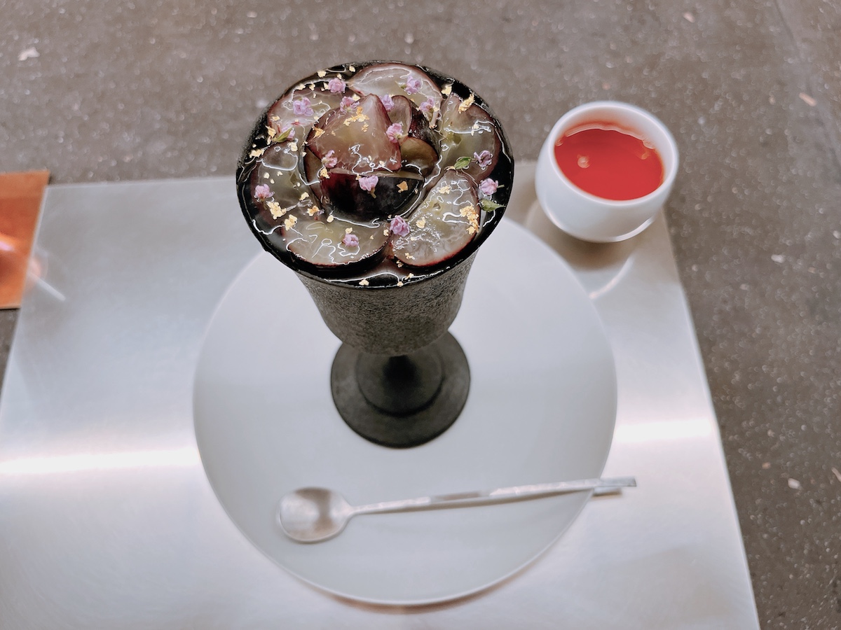 「葡萄と浅煎りほうじ」は提供された瞬間から思わず声が出そうな華やかさ。たっぷりのぶどうに、はちみつとローズヒップのブラマンジェ、みょうがアイス、ほうじ茶アイス、みょうがのコンポートなど最後までその感動が続くとっておきのデザートです。
