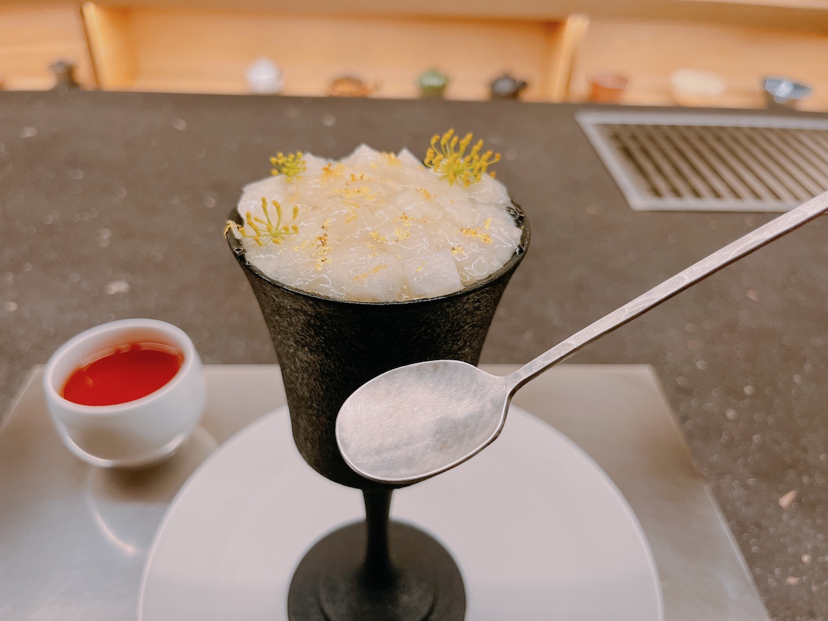 また実はこのパフェグラス、木でできているんです。漆作家の船木智仁さんに特別にお願いして「いっせん」のために作ってもらったもの。さらにパフェスプーンも金沢の作家竹俣勇壱さん作の貴重なもの。見た目のスタイリッシュさはもちろん、食べやすさにもこだわったここでしか目にすることができない貴重な食器です。