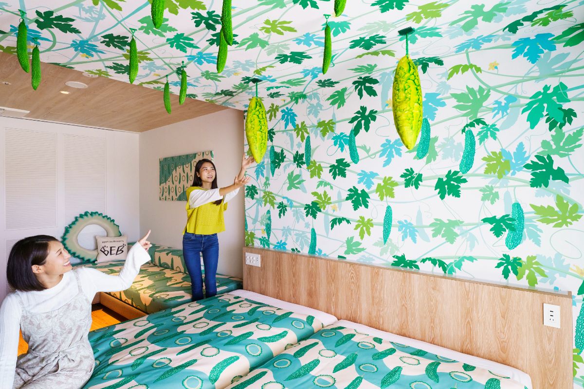 なかでも特徴的なのは「ゴーヤルーム」。ゴーヤ色に装飾された客室には、ゴーヤの輪切りの形をしたクッションやオリジナルルームウエア、ゴーヤサングラスを用意。この部屋ならではのユニークな写真を撮って盛り上がってみませんか?