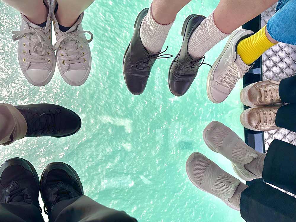 展望台にある強度ガラスで作られた「ショッキング・ブリッジ」。足元が透明のガラス張りなので、ドキドキ体験を楽しめます。