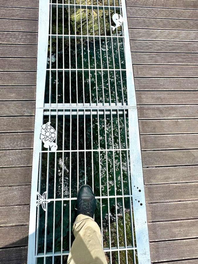 遊歩道のところどころ床がステンレスの蓋か強化ガラスになっていて、真下の海面が見えるしくみに。足がすくまないように!