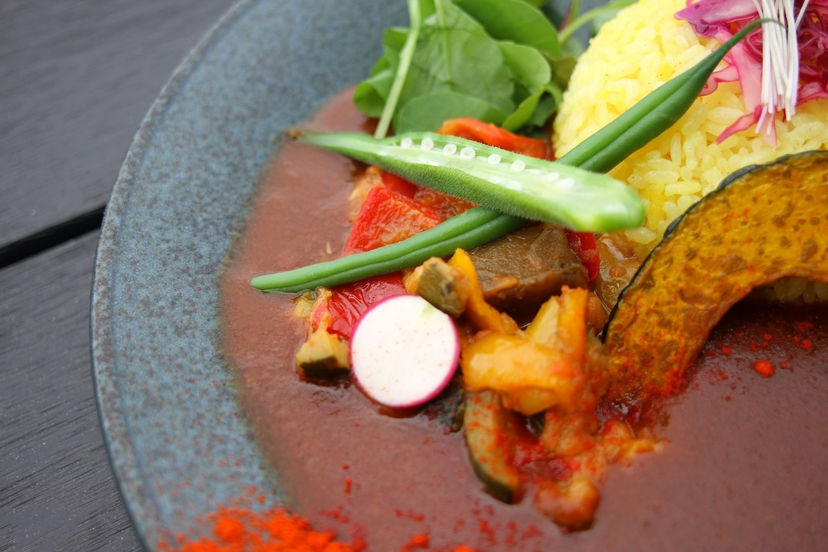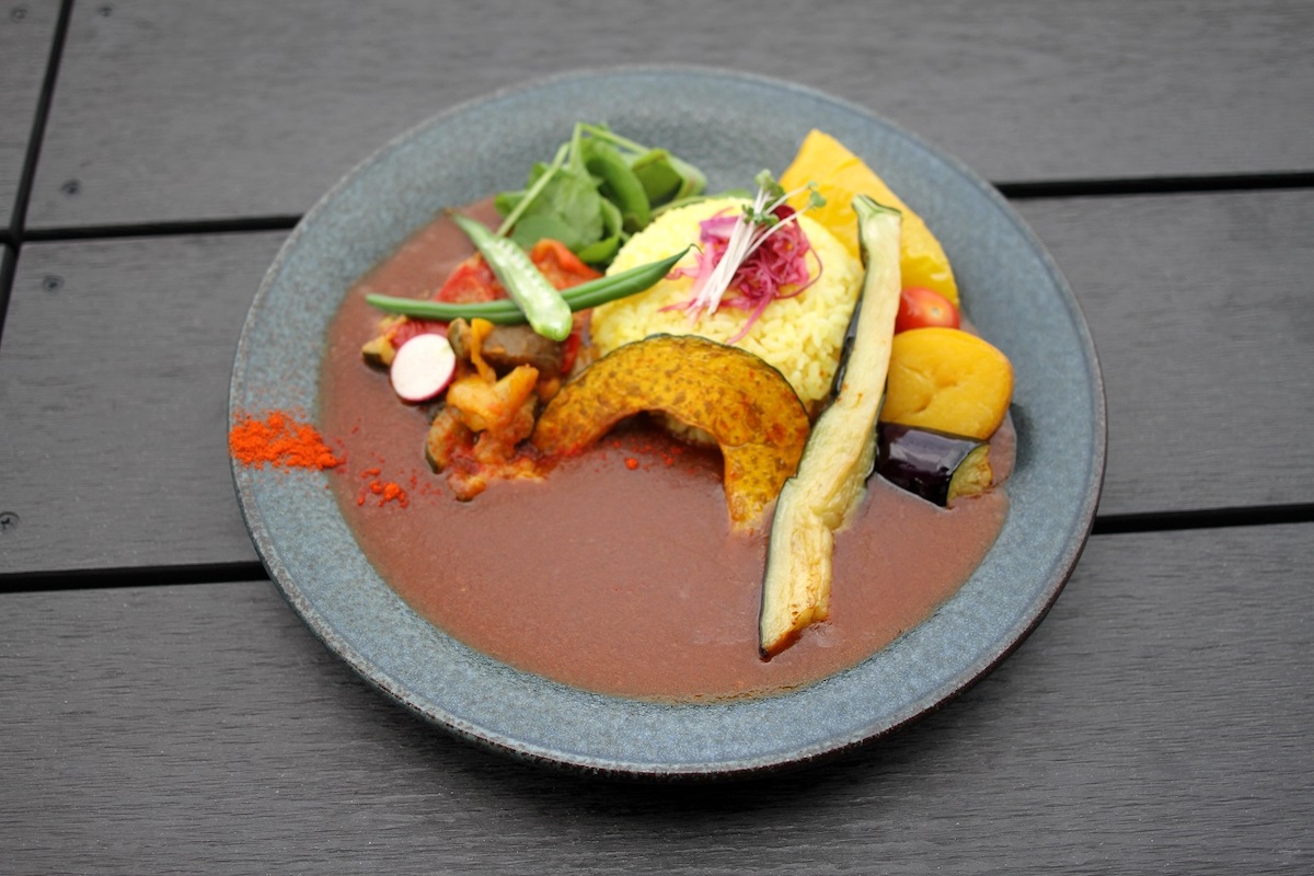 カレールーはマイルドな味わいですが、トッピングされているチリパウダーを一緒に食べると、スパイシーな辛さが加わってアクセントに。夏野菜のトマト煮込み「カポナータ」との相性も抜群で、いろいろな味が楽しめます。