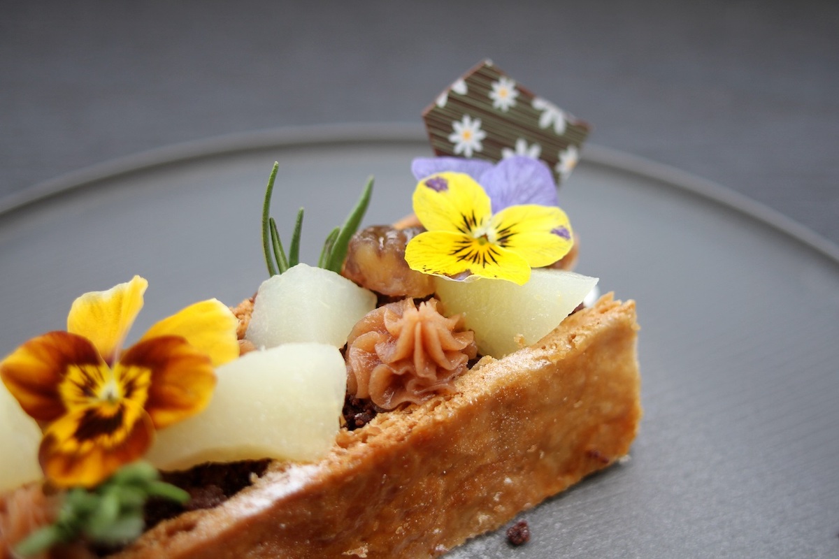 こちらの「小さなお庭のミルフィーユ」1280円には、季節のフルーツと食用花のエディブルフラワーをトッピング。取材日には、梨や栗といった秋の食材が使われていました。