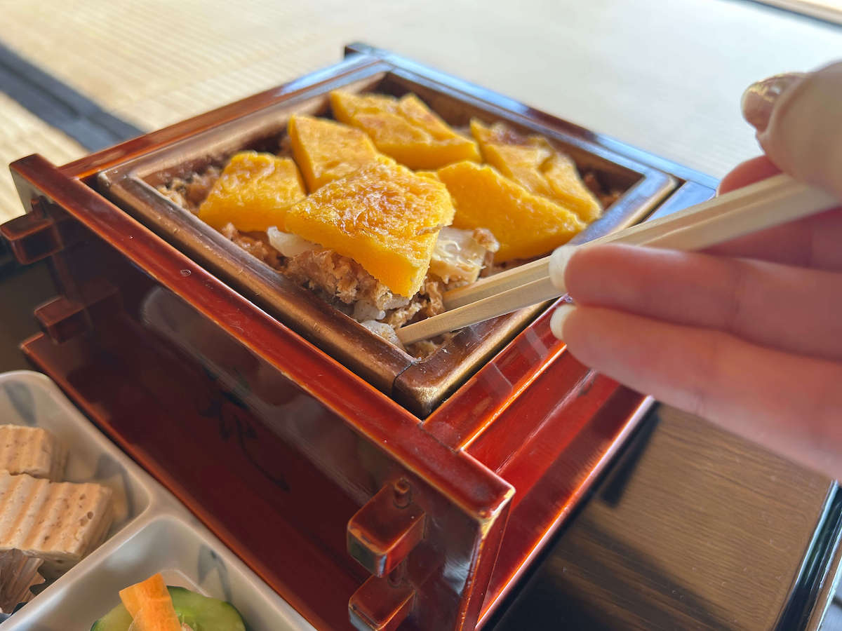 神岡町で会席料理を提供する「花の家」の「蒸し寿司」。酢飯の上に、でんぶ、レンコン、干しシイタケ、お揚げ、玉子焼をのせ、ふっくら蒸しあげた神岡名物料理です。やさしい繊細な味わいにほっこり。目の前に広がる庭園を眺めながらいただく食事はいっそうおいしく感じられます。