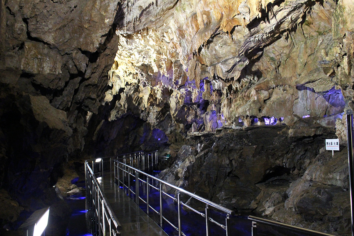 入ってすぐ現れるのが、青く照らされた地下水の上に広がる蒼白の鍾乳石「竜宮の夜景」。苔が生えないようカラーライトでライトアップされた空間は、きれいに輝き幻想的な雰囲気をいっそう高めてくれています。