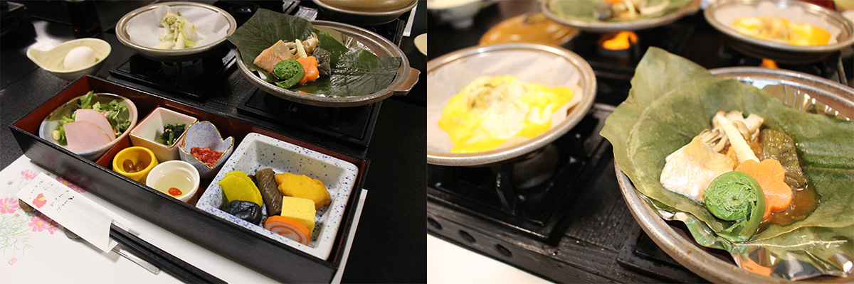 奥飛騨ならではの山菜や川魚など、地元の旬の食材を使った料理は一番の楽しみ!夕食は飛騨牛を味わえる会席料理を。鮎の塩焼や鰻柳川鍋など、さまざまな食材を多様な味わい方で満喫できます。