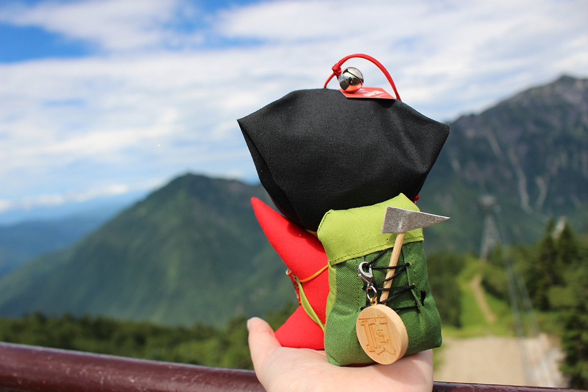 なお、私の手にのって山を眺めているのは、リュックを背負った登山スタイルのかわいい“さるぼぼ”「頂登山さるぼぼ」2750円!西新穂高駅売店にて限定販売されています。
