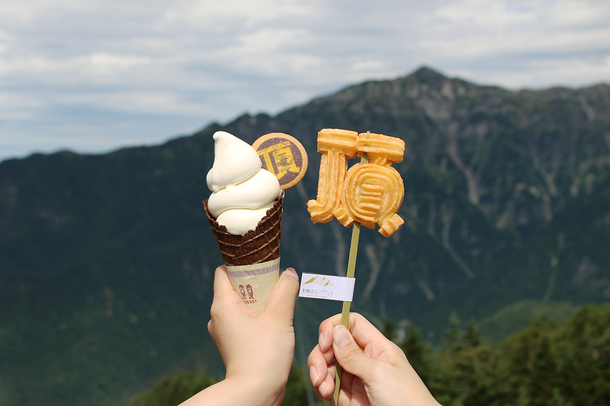「頂」の文字をモチーフにした商品はグルメにも!「頂」の文字がプリントされたクッキーが添えられた「頂ソフト」710円と、米粉を使った「頂チュロス」510円は写真映えも必至のフード!山頂へたどり着いた記念に、山と一緒に写真を撮ってSNSにアップしてみては。