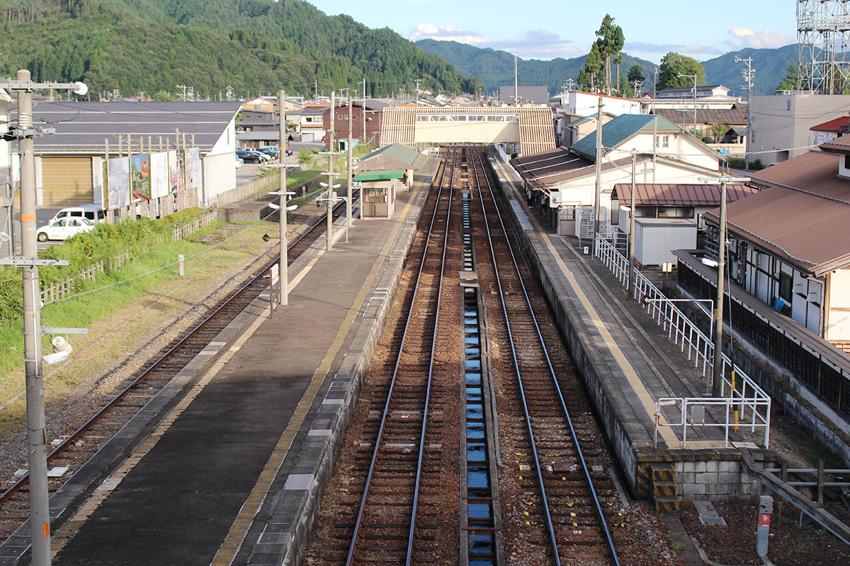 2日目は飛騨古川エリアを楽しむ1日に!この写真を見てあるシーンを思い浮かべた方はいるでしょうか。…そう、ここは映画『君の名は。』のモデルになったといわれ、聖地としても話題になった町なんです。駅から見えるこの光景は、主人公が駅に降り立つシーンのモデルとなっています。