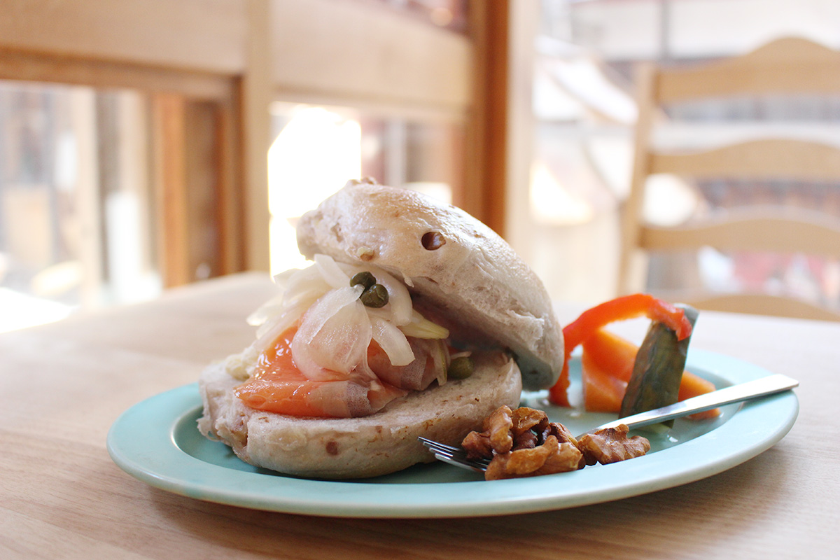 定番メニューの「飛騨の森のベーグルサンド」850円を注文。サンドされているのはスモークサーモンとクリームチーズという間違いのない組合わせです。もっちりとしたベーグルにはナッツが練り込まれていて食感も楽しめます。広葉樹のチップで燻された燻製クルミも添えられています。