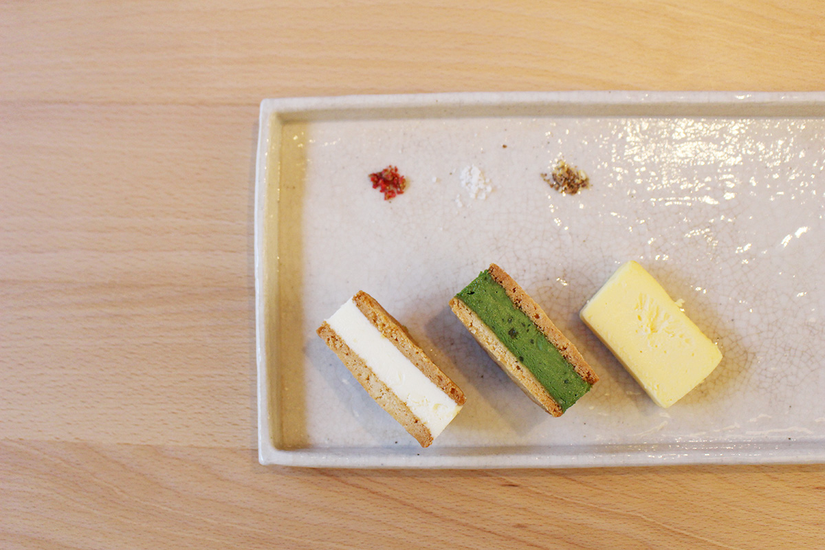 私に提供されたのは、プレーンと大好きな抹茶のチーズバターサンドのセット!お皿の上にはピンクペッパー、岩塩、山椒が添えられていて、お好みでチーズテリーヌやチーズバターサンドに付けて味変を楽しめます。