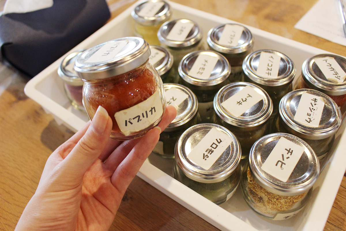 まずは16種類ある薬草や野菜パウダーのなかから、好きなものをチョイス。「サンショウ」や「クロモジ」といった薬草だけでなく、「カボチャ」や「ホウレンソウ」などおいしそうなものも…。入れる種類の数に制限はないので、もちろん全部を入れても大丈夫。