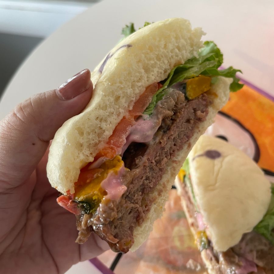 ベイマックスをモチーフにしたふんわり白いパンの間に、レタス、トマト、カボチャなどの野菜と、厚さ1.5㎝ほどのバンズと甘辛牛カルビがイン。カボチャの優しい甘さと紫イモパウダーを混ぜたマヨネーズが味のアクセントになっています。