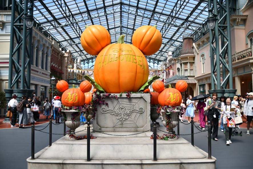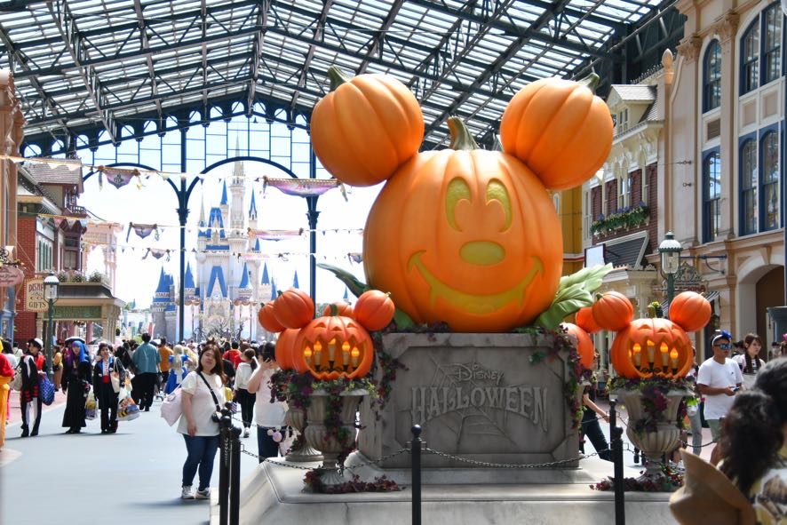 ワールドバザールには巨大なミッキー型カボチャが登場!周りにはろうそくが灯るジャックオランタンが。