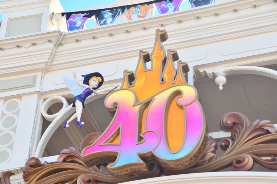 40周年の文字の部分に魔女コスチュームのティンカーベルが!周囲のガーランドもハロウィーン仕様になっています。