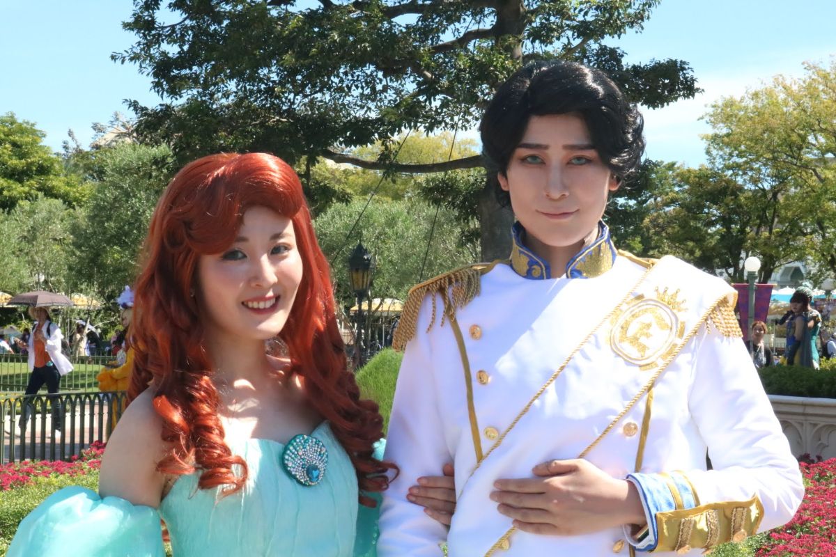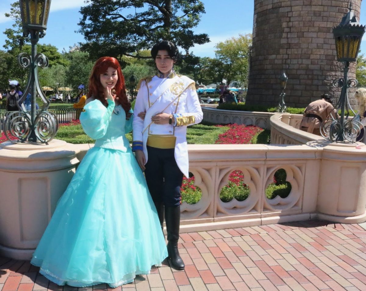 シンデレラ城前で声をかけさせていただいたのが、アリエルとエリック王子に扮したお二人。いつも手作りで衣装を用意されているそうです。