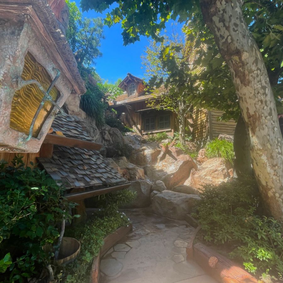 シンデレラに扮した女性のおすすめの撮影場所は、小さな花がたくさん咲いていてかわいいクリッターカントリーの奥、スプラッシュ・マウンテンの出口付近とのこと。プレスプレビュ―の日はお花があまり咲いていませんでしたが、ちょっと奥まった場所に滝や水車小屋などがあり、撮影スポットには最適!
