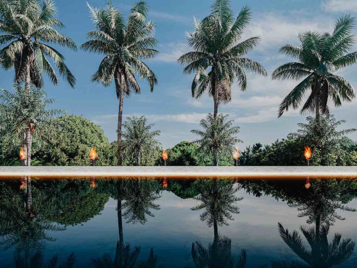 「BLACK POOL」の左右にはヤシの木が配され、夕暮れとともに火が灯り幻想的なムードに。