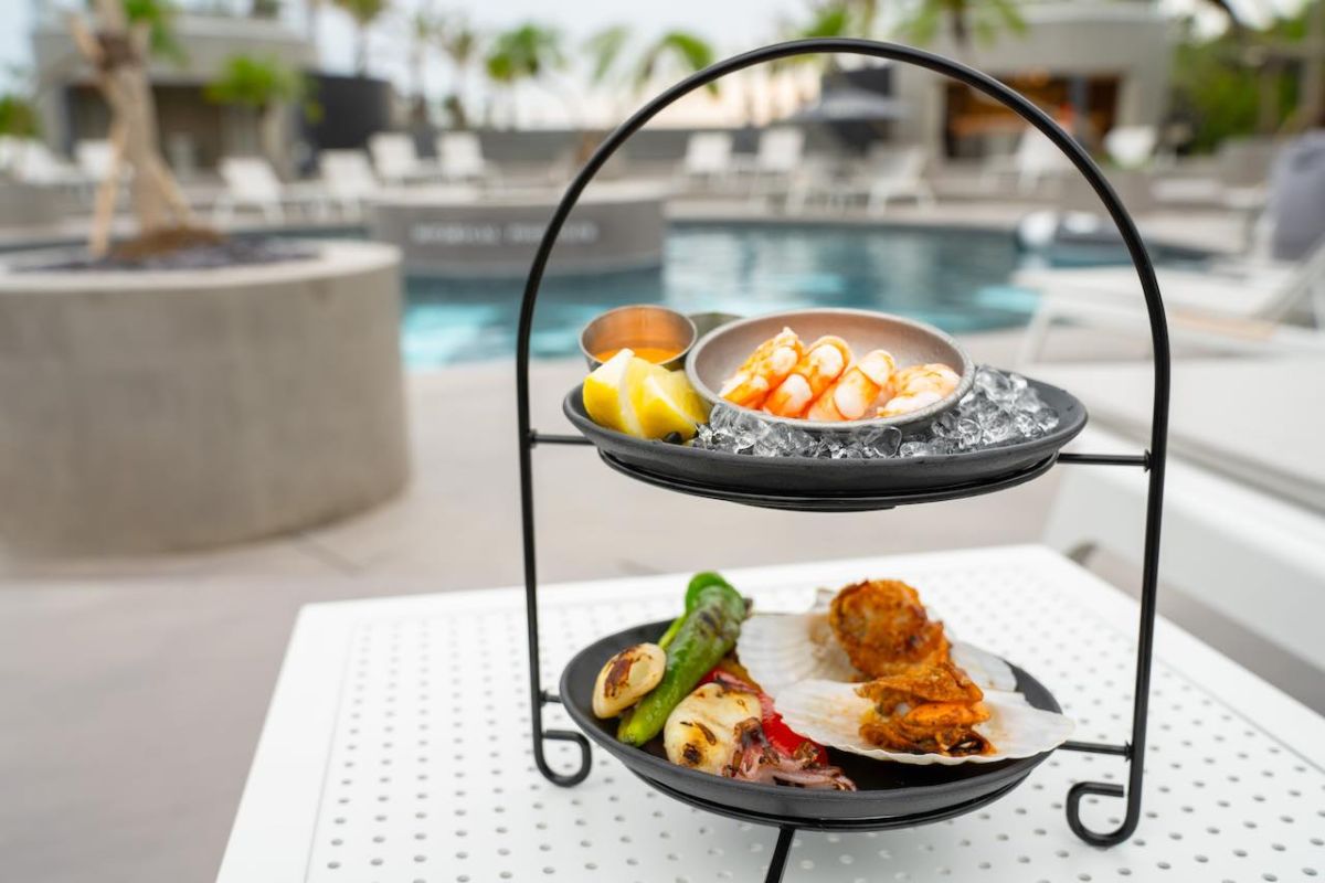 プールサイドではスナックやフードのオーダーも可能です。こちらはシュリンプカクテル、ヤリイカ・野菜のグリル、ホタテのバターソテーに2種のソースがついた「Poolside low flow」5800円。小腹が空いたときやアルコールのお供に最適です。