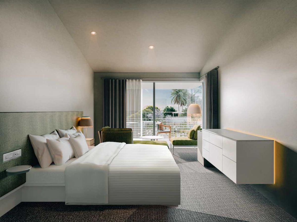 1階にあるのはスタンダードタイプの客室「POOL CLUB ROOM」。窓の外にはボタニカル、そしてその先にプールが見えます。