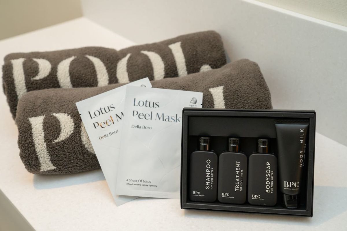 シャワー用のタオルに加え、全身を包んでくれるプール用のタオルもあります。オリジナルのアメニティには、ボディミルクやフェイスパックも用意。プールで思いっきり遊んだ後のケアまで考えられているのがうれしいですね!