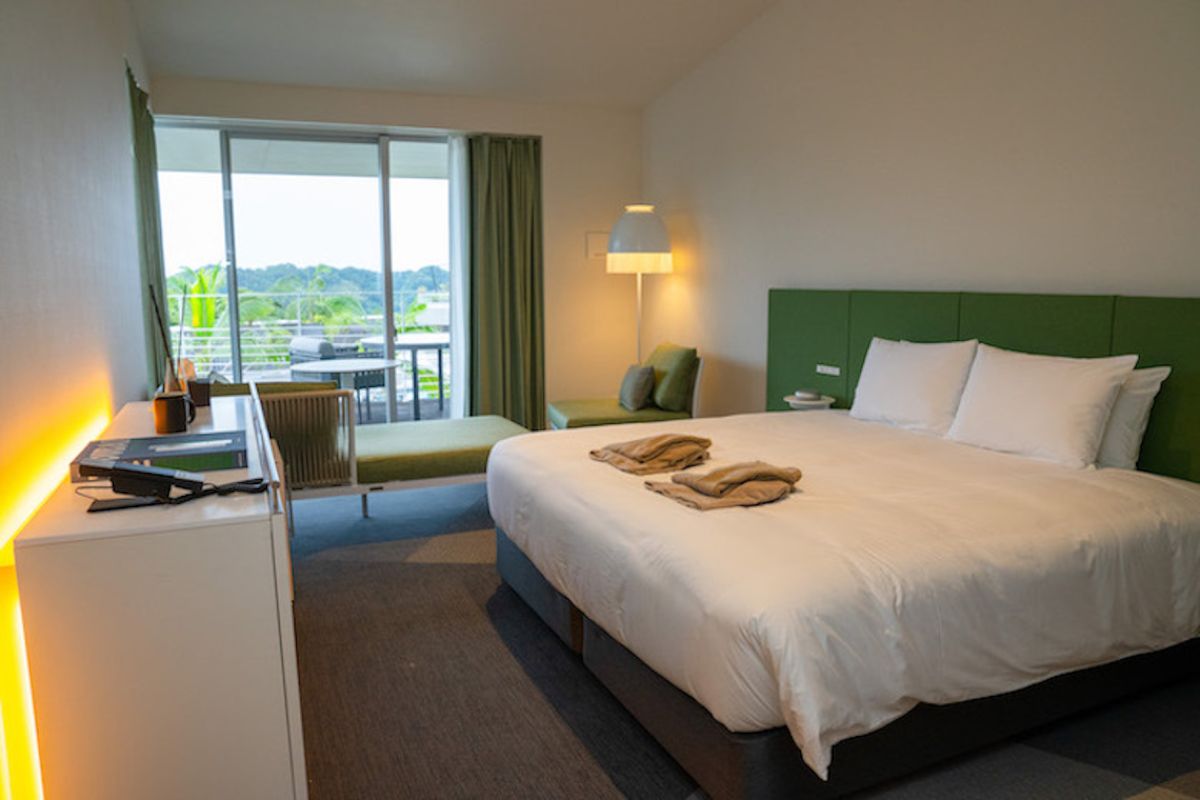 宿泊したのは、客室棟2階にある客室「POOL TERRACE」。キングサイズのベッドが1台とソファベッドがあり、最大2名まで宿泊できます。室内はシンプルモダンなインテリアが設えられ、リラックスできる空間です。