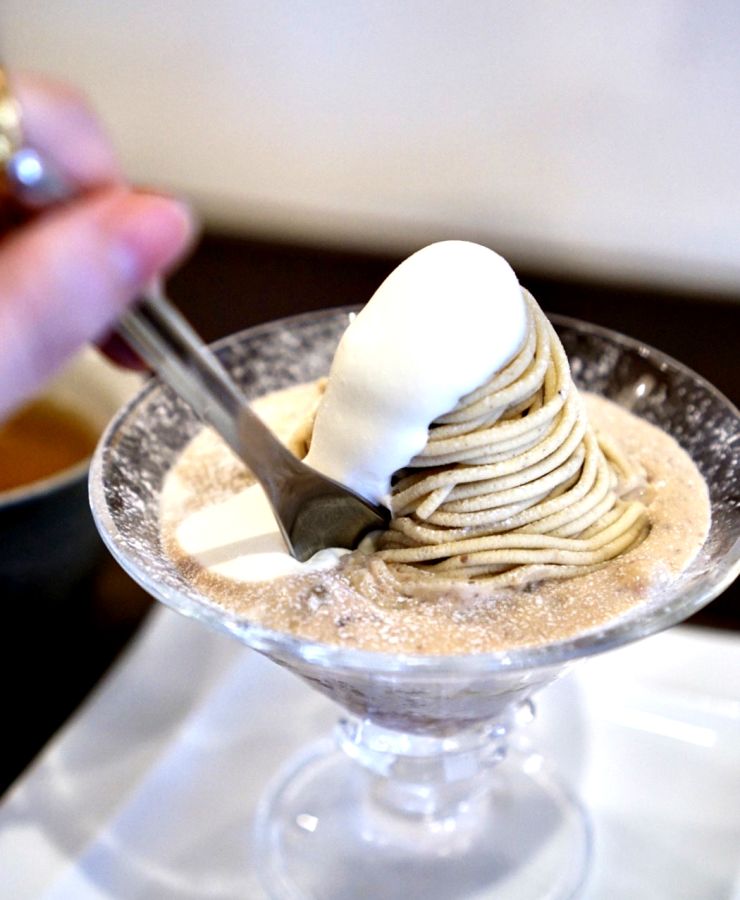 モンブランクリームのこっくりとした味わいに、甘くなりすぎないように塩気のある無花果のアイスが合わさっています。あられをまぶして香ばしいアクセントを加えているのもポイントです。