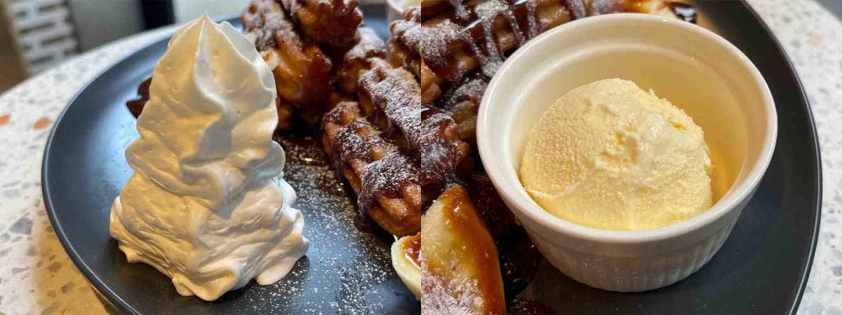 「キャラメルバナナチュロス」950円、「ホイップクリーム」100円、「バニラアイスクリーム」200円
