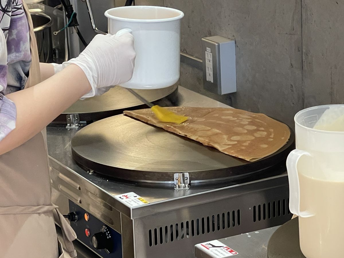 注文を受けてから焼き始めるクレープには、タンパク質や水分、不純物を取り除いて作る純粋なバターの「ギー」が塗られています。