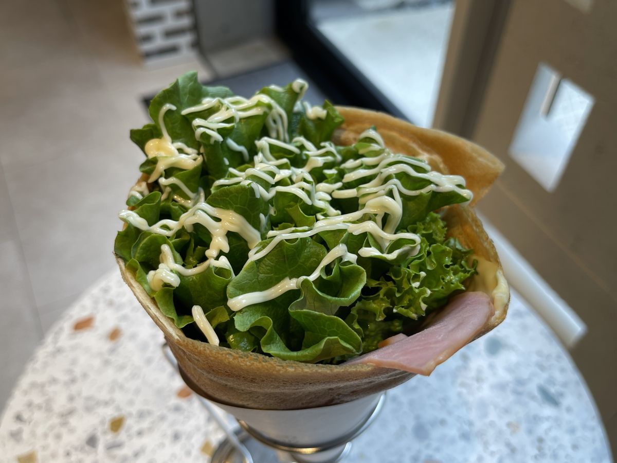 今回はサラダ系から「ハムチーズ」をチョイス。野菜は無農薬かオーガニックのものだけを使用しているそう。クレープ生地の余熱でとろけたチーズと、レタスのシャキシャキ食感が楽しいクレープです。新鮮なレタスがたっぷり入っているので、ボリューム満点なのもうれし