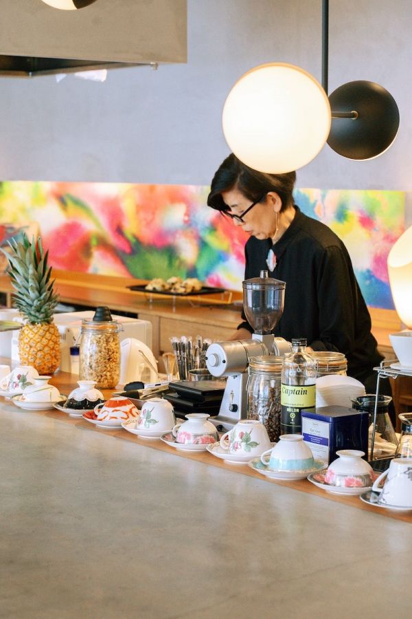 店内のデザインはあくまでシンプル&モダンに整えつつ、カウンター奥にある大胆なグラフィックアートでもてなしの心を表現。アートワークはデザイナーの藤田二郎氏によるものです。すっきりとした家具や照明を取り入れながらも、純喫茶で愛されてきたボーンチャイナのカップ&ソーサーを使用するなど、昔と今とがシームレスにつながる空間が誕生しました。