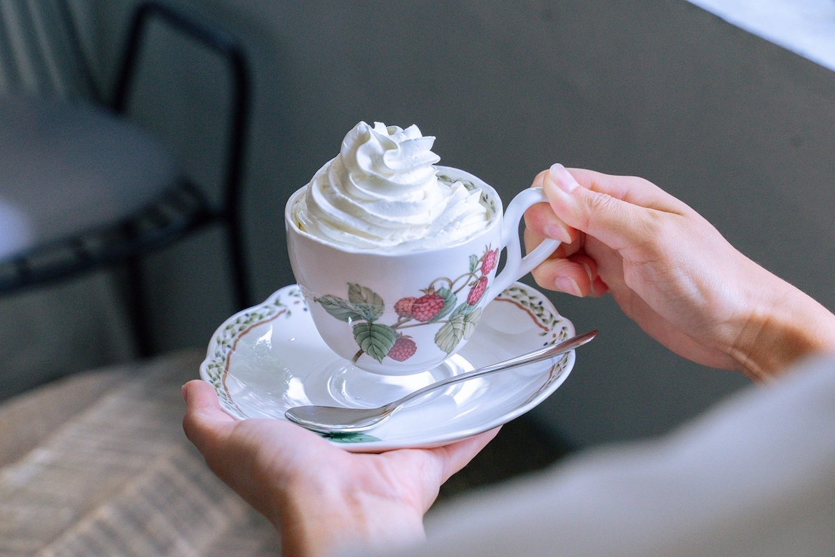 こんもりと盛られたホイップクリームに思わず頬が緩みます。クラシカルなカップ&ソーサーの柄とも相まって、なんともぜいたくな気分。