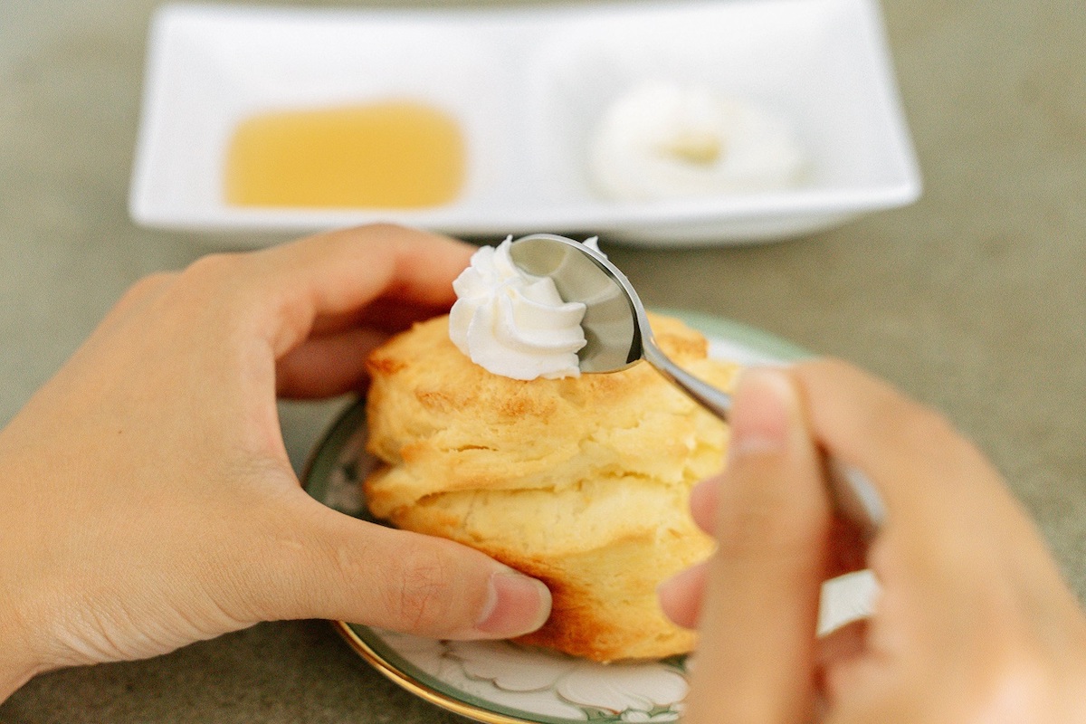 焼き菓子類は、りんごのタルトやバスクチーズケーキ、スコーンなどが定番メニューとして用意されています。今回はウインナーコーヒーのお供に「スコーン」をチョイス。ホイップクリームとメープルシロップが添えられます。