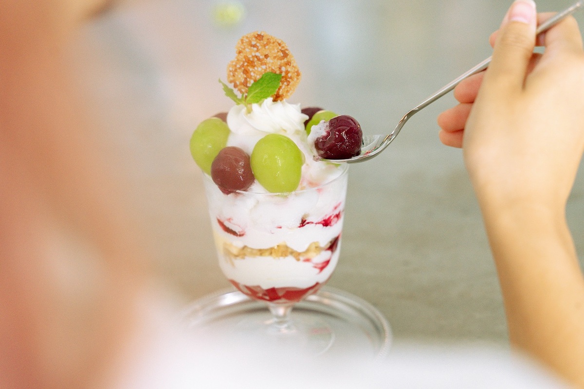 また、季節ごとの楽しみとして多くのファンに愛されるのが万里さんお手製のパフェ。9月から登場した「シャインマスカットと巨峰のコンポートパフェ」は、下からフレッシュな巨峰で作ったゼリー、水切りヨーグルトのクリーム、グラノーラ、ホイップ、ブルーベリーソース、バニラアイス、自家製レモンソルベ、巨峰のコンポート、シャインマスカット、チュイールという豪華な構成。