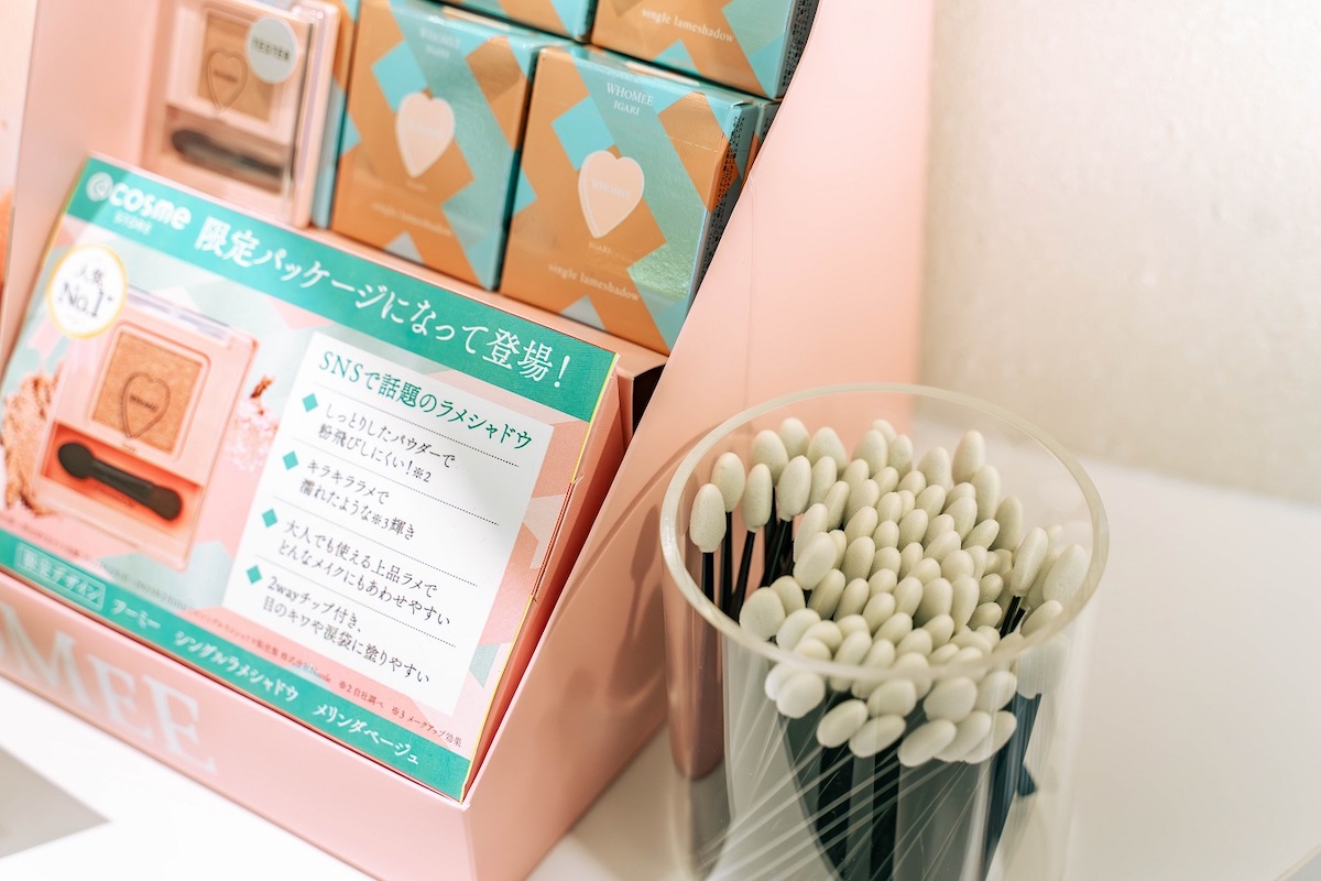 売り場にはテスターが各所に備えられ、棚の一つひとつにも綿棒やコットンなどを設置。気になるテスターを好きに使いながら、発色や肌へのせたときの雰囲気を実際に目で見て確かめられます。