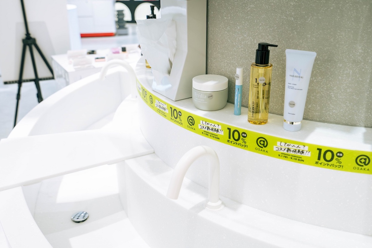 店内中央には大きな洗面台が用意されているので、備え付けのクレンジングを使ってしっかりオフできるのもうれしいポイント。もちろんクレンジングもテスターとなっているので、店内での購入も可能です。試してオフして試してオフして……と、気づいたら1時間以上店内にいた、なんてこともありそうです!