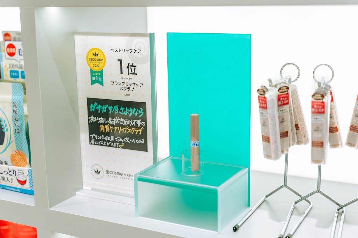 2022年のベストリップケア部門1位キャンメイクの「プランプリップケア スクラブ」594円があるなど、用途も価格帯もさまざまなものが一覧できるうれしさ! アイテムに添えられた美容部員さんの手書きポップも楽しく、全部試してみたくなります。