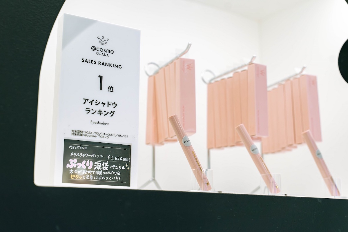 さらに奥へ進むと@cosme OSAKA セールスランキングタワーが現れます。こちらでは「@cosme OSAKA」で今売れている商品をランキング形式で紹介していて、トレンド感もばっちりです。