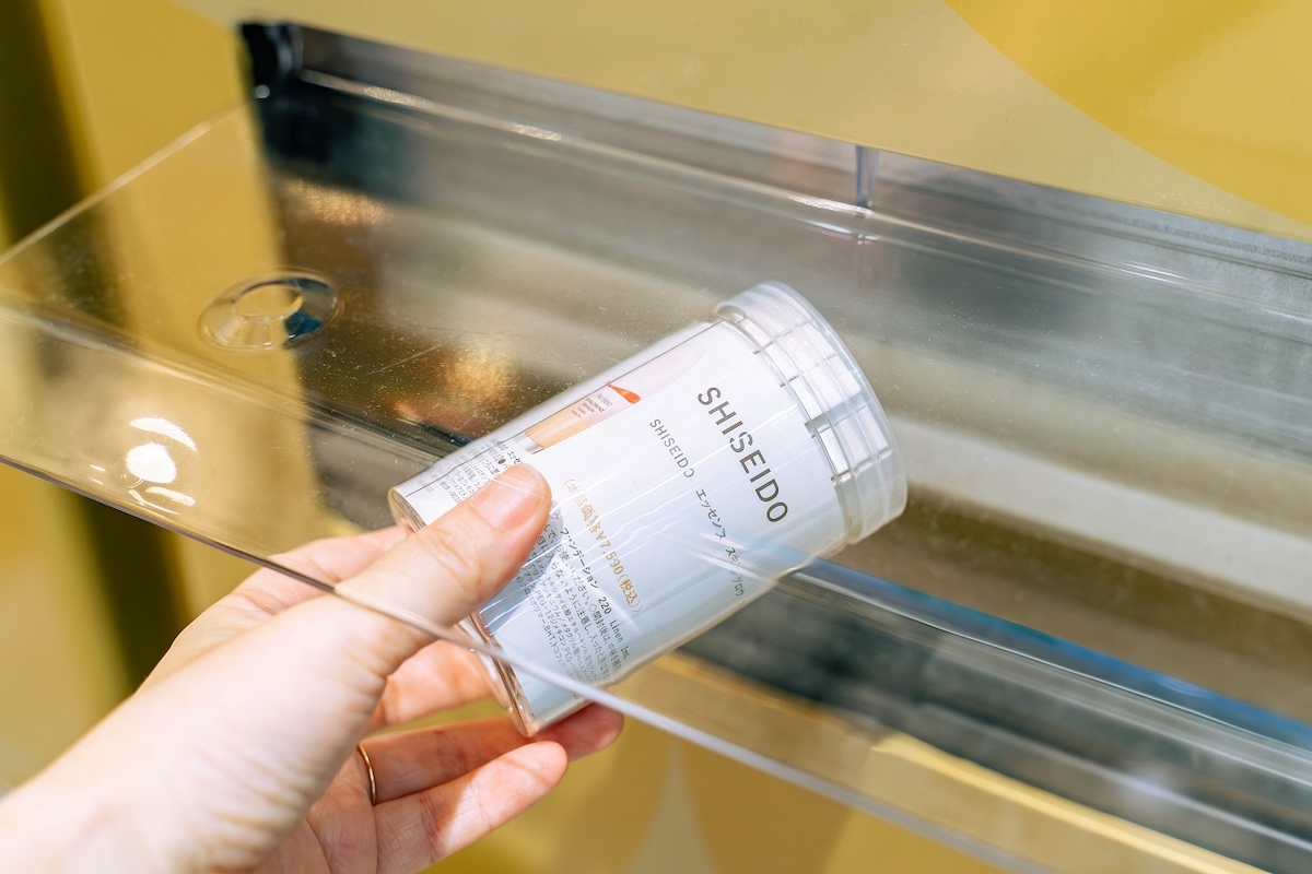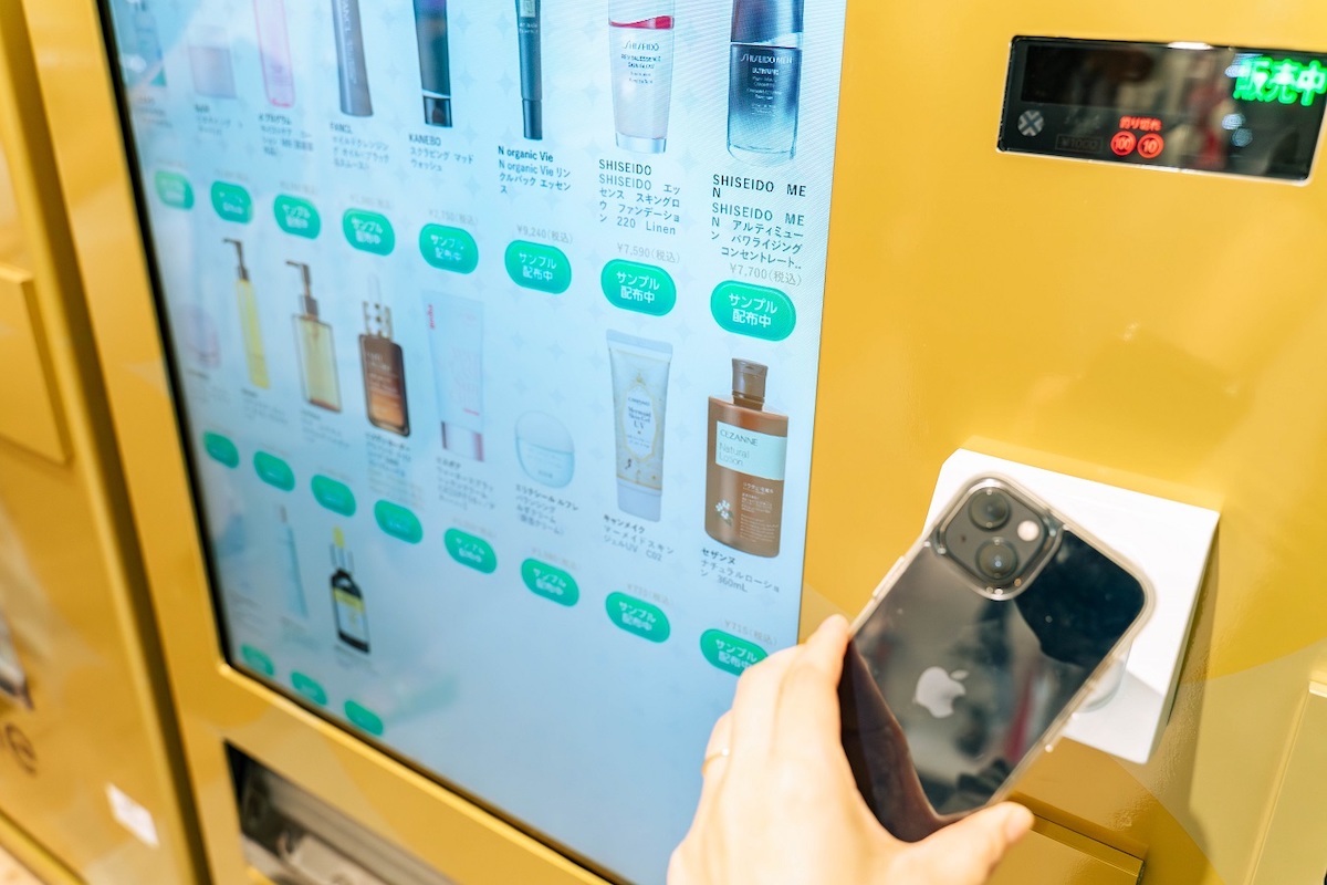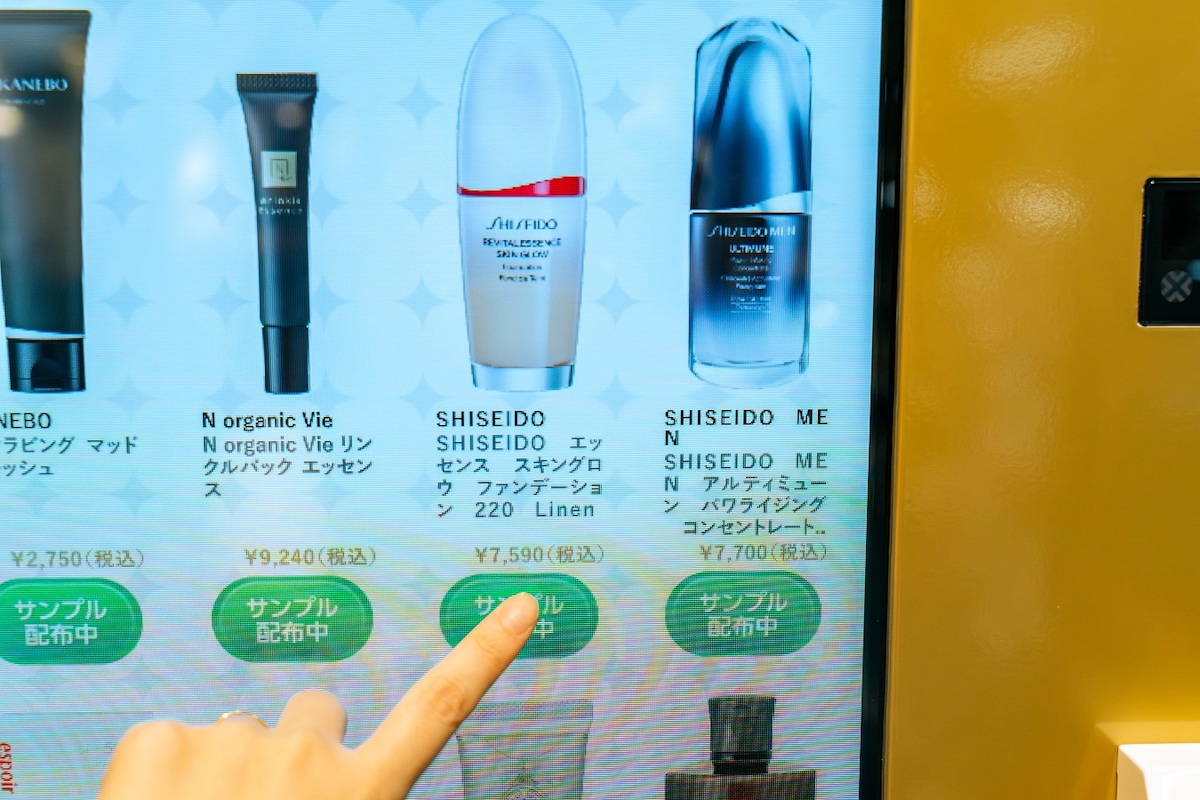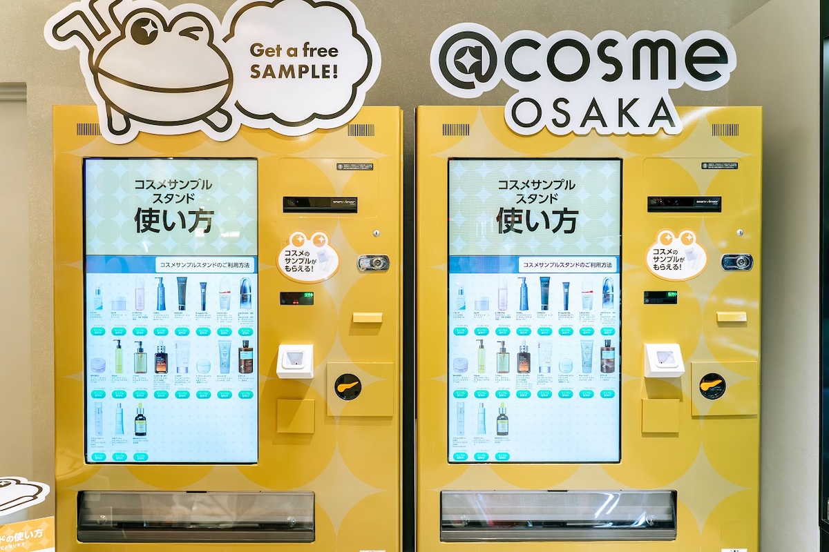 店内奥に設置されている自動販売機型のコスメサンプルスタンドは、訪れたらぜひ利用して。まずは@cosmeのアプリをスマホに入れて、